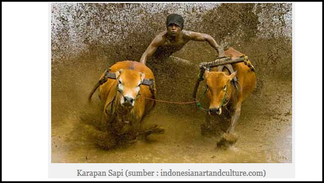 Karapan Sapi adalah olahraga pacuan sapi yang berasal dari Madura. Dalam permainan yang satu ini, sepasang sapi lah yang ‘berolahraga’ dengan menarik semacam kereta kayu melewati lintasan sepanjang 100 meter. Joki sapi hanya perlu berdiri di kereta kayu dan mengendalikan laju sapi-sapinya agar tidak oleng. Tetapi jangan dikira menjadi joki karapan sapi itu pekerjaan yang mudah ya, karena tentu saja diperlukan latihan dan keahlian yang khusus. Keseriusan warga Madura dan pemerintah Indonesia dalam melestarikan karapan sapi tidak main-main. Karapan sapi kini telah menjadi sebuah ajang pesta rakyat yang mampu menyedot ribuan pengunjung dari dalam maupun luar negeri. Setiap akhir bulan September atau Oktober bahkan diadakan pertandingan karapan sapi terbesar yang memperebutkan Piala Bergilir Presiden. Sayangnya dibalik kemeriahan ini sering ditemukan pelanggaran para peserta yang kerap memperlakukan sapi-sapinya dengan kejam agar bisa berlari dengan kencang. Kebiasaan ini tentu saja sangat melenceng dari nilai aslinya dan selayaknya patut ditindaklanjuti dengan tegas oleh pihak penyelenggara.