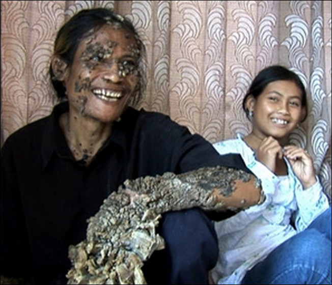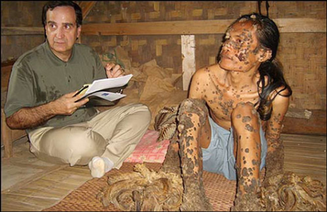 Pria tersebut memiliki tangan dan kaki layaknya cabang pohon... sudah 20 tahun dia terserang penyakit itu... dia mempunyai banyak sekali kutil di sekujur tubuhnya... berat dari kutil tersebut berkisar 6 kg... Diperkirakan, penyakit ini disebabkan oleh virus HPV... ada dua jenis virus HPV tsb, yang pertama menyebabkan kanker pada tulang tengkuk (cervical) dan yang kedua menyebabkan kutil... Kutil pada pria tsb mulai nampak setelah dia terkena luka goresan di kulitanya sewaktu remaja... kemudian kutil tsb makin banyak bermunculan di sekujur tubuhnya... Kulitnya juga telah terinfeksi dan banyak bakteri dan binatang-bintatang kecil yang hidup di kulitnya...
