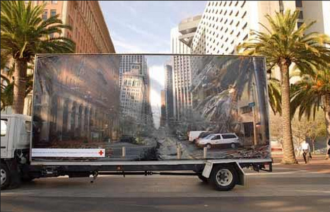 Palang merah membuat iklan ini dengan ilusi optikal untuk membuat orang-orang yang melihatnya lebih awas terhadap gempa bumi dalam kampanye awas gempa di san fransisco.
