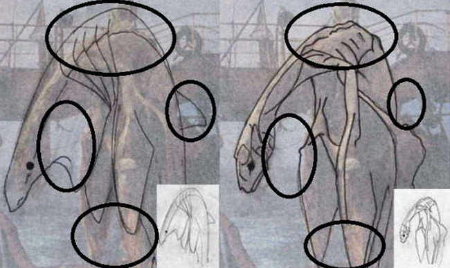 Perbandingan Bangkai dengan Paus (kanan), Perbandingan bangkai dengan Plesiosaurus (kiri)