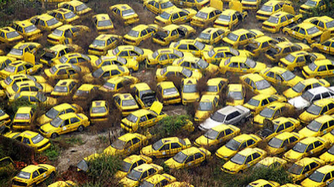 Ribuan taksi bekas ditinggalkan di halaman di pusat Chongqing, Cina. Kemacetan lalu lintas dan polusi telah memburuk secara dramatis di kota-kota Cina karena pertumbuhan ekonomi negara itu telah membuat peningkatan jumlah penduduk yang kaya dan mampu membeli barang mewah seperti mobil, yang berarti tidak banyak lagi yang mengandalkan taksi atau angkutan umum.