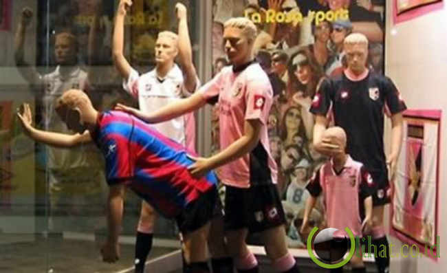 Ow, manekin berpakaian jersey klub sepakbola ini mungkin terlalu frontal untuk diletakkan di ruang publik. Apakah kamu berpikir bahwa kedua manekin itu melakukan adegan porno? Hmm, karena itu ada manekin anak kecil di belakangnya yang langsung ditutup matanya.