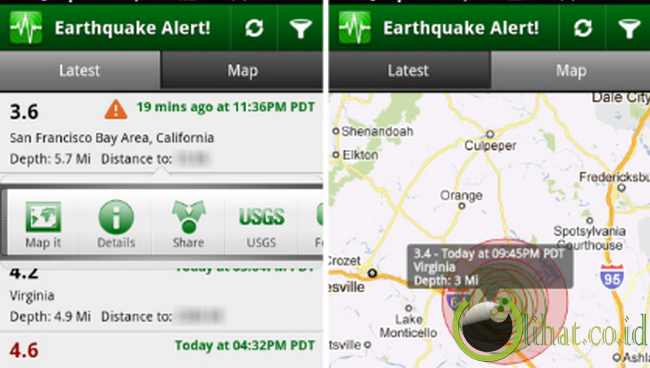 Terdambakan - Selain aplikasi info Gempa dan Cuaca, saya juga menginstall aplikasi Earthquake Alert! ini. Menurut saya Earthquake Alert! merupakan aplikasi yang sangat bagus dalam memberikan informasi gempa terkini yang bersumber dari data USGS (United States Geological Survey). Menggunakan aplikasi ini, kita bisa melihat kejadian gempa di seluruh dunia yang sedang terjadi mulai dari skala 1 Mw – seterusnya dan ditampilkan dalam peta dunia.