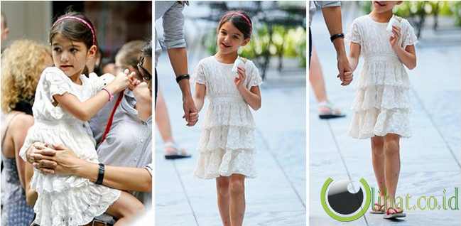Terdambakan - Baju terusan warna putih ini sangat manis untuk gadis seusia Suri. Bagian bawah berupa lipatan tumpuk sangat disukai anak perempuan. Suri tidak lepas dari bando kesayangannya. Yang paling penting, Suri sudah tidak pernah tertangkap kamera memakai high heels. Sekarang Suri lebih sering terlihat memakai sandal jepit yang cute.